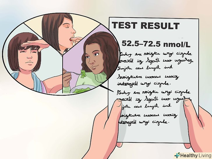 Слідкуйте, щоб рівень вітаміну D залишався в рекомендованих межах. коли ви отримаєте результати тесту на дефіцит вітаміну D, необхідно інтерпретувати їх і зробити відповідні зміни в способі життя. Результати тесту виражаються в одиницях концентрації нмоль/л (наномолей на літр) (або нг / мл (нанограмів на мілілітр) в США). Це відповідає вмісту кальцидіолу в крові, яке є надійним індикатором рівня вітаміну D в організмі.- Згідно з Міжнародним товариством ендокринологів, значення нижче 50 нмоль/л свідчать про дефіцит вітаміну D. Якщо результати лежать в інтервалі 53-73 нмоль/л, це показує, що у вас немає дефіциту вітаміну D, однак його недостатньо. [23]