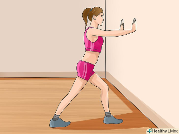 - Ви також можете встати, поклавши руки на стіну. Поставте носок зведеної ноги на стіну, але щоб п'ята при цьому залишалася на підлозі. Тримайте ногу прямо і нахиляйтеся у напрямку до стіни, тим самим розтягуючи ікри.