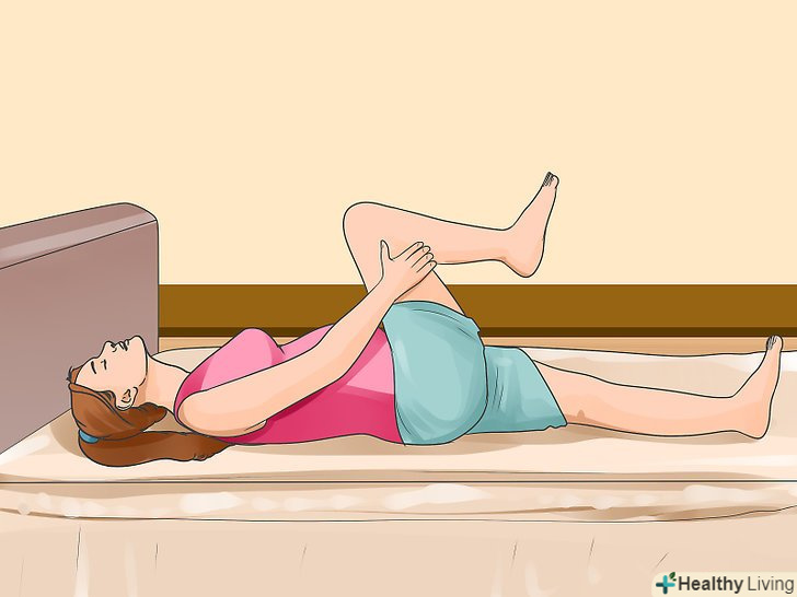 Зробіть розтяжку підколінного сухожилля.ви також можете розтягнути підколінне сухожилля, якщо ляжете на спину і будете піднімати коліна до грудей. Якщо вам хтось може допомогти, попросіть їх злегка натискати вам на коліна, притискаючи їх ближче до грудей. Дивіться не натискайте на живіт. [35]