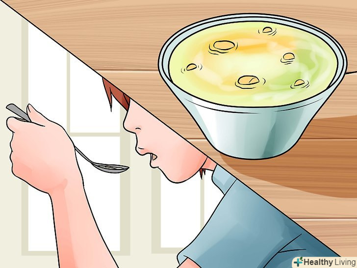 Замініть тверду їжу рідкими стравами.якщо вам важко їсти тверду їжу або вона не викликає у вас апетиту, їжте супи і пийте смузі, щоб отримувати необхідну кількість калорій. Спробуйте готувати страви з збагаченим білками молоком або додавайте його в інші напої. Щоб отримати збагачене білками молоко, змішайте 1 літр цільного молока і 1 стакан (130 грамів) знежиреного сухого молока. Збивайте суміш до повного розчинення порошку (це займе близько 5 хвилин). Можна також готувати такі супи і смузі:[14][15]- Пікантний протеїновий смузі. Змішайте ⅓ склянки (близько 70 грамів) сиру або простого йогурту, ½ склянки (100 г) ванільного морозива, ¼ склянки (40 г) готового до вживання желатину з фруктовим ароматом і ¼ склянки (60 мл) нежирного молока, щоб вийшла однорідна маса. Випийте смузі, поки він свіжий.