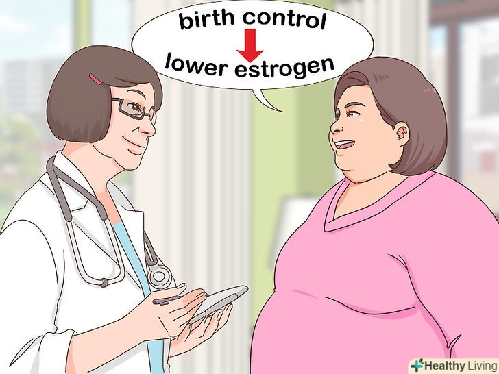 Поговоріть з лікарем про варіанти контрацепції з більш низьким рівнем естрогену.іноді набір ваги пов'язаний з високим рівнем естрогену в протизаплідному препараті. Якщо ви поправилися в результаті прийому певного орального контрацептиву, можливо, Вам варто подумати про зміну поточного методу контрацепції, або про зниження дози естрогену.[14]- Існує чимало протизаплідних препаратів з низькою дозою естрогену.