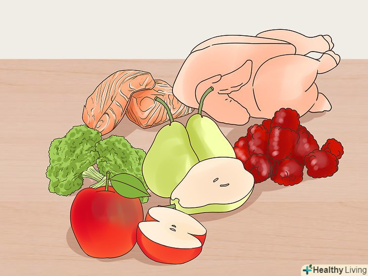Вживайте продукти, багаті клітковиною і нежирним білком. раціон з великою кількістю клітковини і нежирного білка допоможе вам скинути вагу або поліпшити ефективність вашого схуднення. Така дієта також допоможе знизити кров'яний тиск і поліпшити здоров'я серцево-судинної системи.[3] намагайтеся вживати 160 грамів білка і 20-30 грамів клітковини щодня.[4]- До продуктів з високим вмістом клітковини відносяться малина, груші, яблука, цільні зерна пшениці і брокколі.[5]