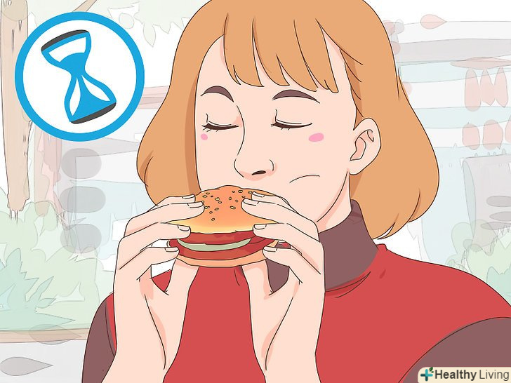 Їжте повільніше.мозку необхідно близько 20 хвилин, щоб усвідомити те, що відбувається в шлунку. А це означає, що ви будете ситі ще до того, як ваш мозок зможе вам про це повідомити. Якщо ви будете їсти повільніше, то уникнете переїдання, і у вашого мозку буде більше часу, щоб повідомити про рівень насичення іншим частинам організму.[9]- Якщо у вас не дуже виходить їсти повільніше, спробуйте більш ретельно пережовувати їжу. Пережовуйте кожен шматочок певну кількість разів, перш ніж проковтнути. Іноді буває корисно вважати відкушені шматочки, поки організм не звикне до більш повільного прийняття їжі.