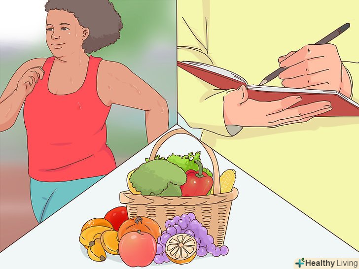 Ведіть щоденник харчування, вправ і ваги.щоб повідомляти свого лікаря точну інформацію про симптоми, варто вести щоденник з усіма відповідними даними. Записуйте все, що ви їсте кожен день, скільки важите, коли тренуєтеся і як довго тривають тренування.[12]- Можна також використовувати такий додаток, як MyFitnessPal, щоб стежити за тим, що ви їсте і скільки тренуєтеся.