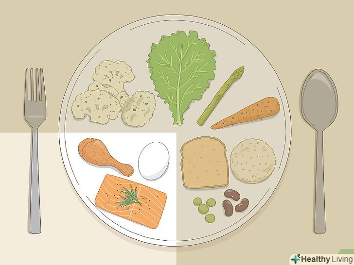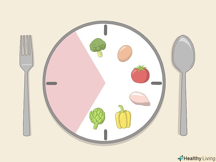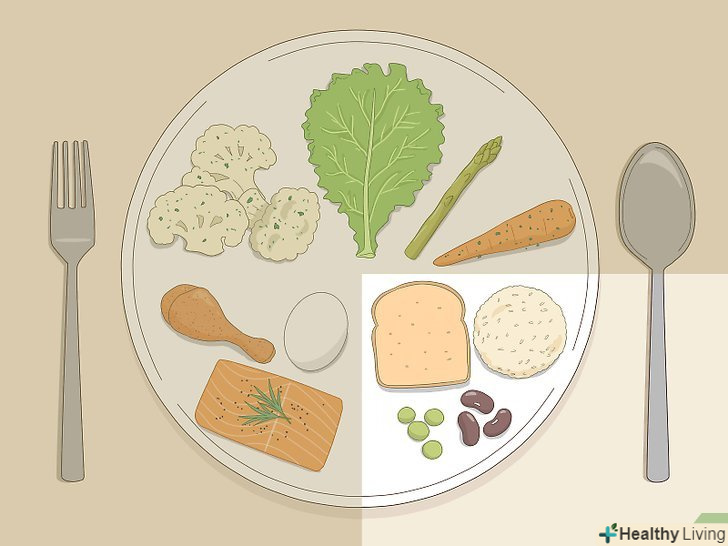 Слідкуйте, щоб при кожному прийомі їжі приблизно половина припадала на некрохмалисті овочі.овочі повинні складати основну частину вашого раціону, так як вони містять мало калорій і багаті необхідними для здоров'я поживними речовинами. Багато експертів рекомендують щодня з'їдати хоча б 4 порції овочів, але якщо ви хочете скинути вагу, вам слід їсти їх ще більше. Збагатите свій раціон некрохмалистими овочами-таким чином ви зможете добре втамовувати голод і при цьому не переїдати.[1]- До некрохмалистих овочів відносяться кольорова капуста, морква, кабачки, салат-латук, спаржа і багато інших смачні продукти, які можна приготувати безліччю різних способів, так що вони не набриднуть вам.