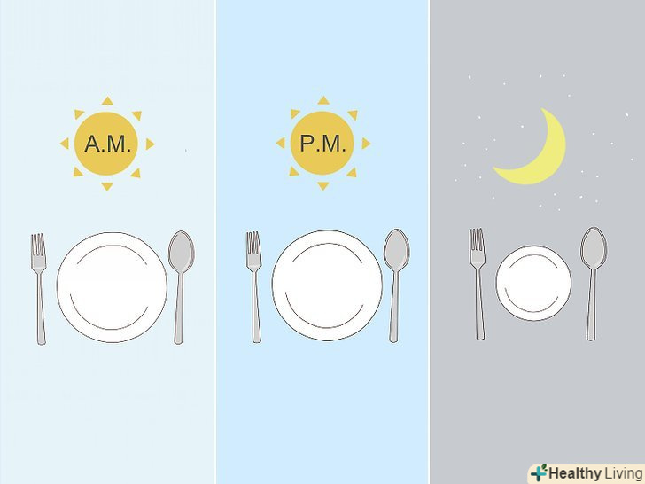 Їжте більше на початку дня і менше ближче до вечора.хоча кількість калорій в одній і тій же їжі не залежить від часу доби, Ви навряд чи будете займатися фізичними вправами ввечері або перед сном. Замість того щоб злегка перекусити за сніданком і завершити день рясним вечерею, щільно снідайте, як слід обідайте і з'їдайте трохи за вечерею. В цьому випадку ви встигнете розтратити калорії протягом дня.[9]- Якщо це не підходить для вашого розпорядку дня, можна спробувати їсти частіше, ніж три рази на день, але меншими порціями. Мета полягає в тому, щоб залишатися ситим і не переїдати через те, що ви встигнете сильно зголодніти між прийомами їжі.