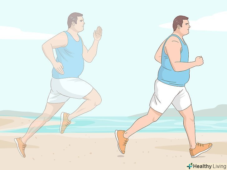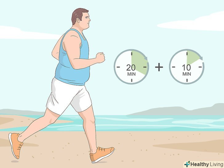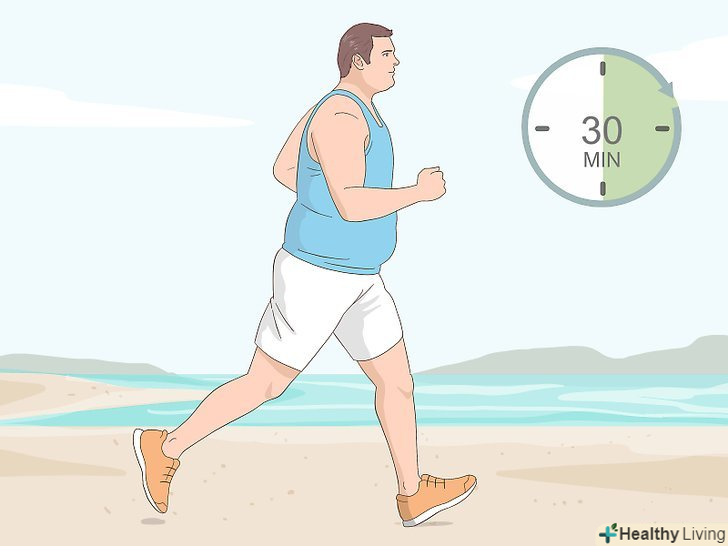 Займайтеся аеробними вправами близько 30 хвилин в день.крім дієти вам будуть потрібні кардіо-вправи. Це такі вправи, при яких частішає пульс, що призводить до прискорення обміну речовин і спалювання жиру.[10] якщо раніше ви не займалися кардіо-тренуваннями, для початку відмінно підійдуть такі вправи, як простий біг або біг підтюпцем, плавання, їзда на велосипеді або заняття на гребному тренажері.[11]- Вибирайте вправи середньої інтенсивності. Необхідно, щоб під час тренувань у вас частішали дихання і пульс, і ви потіли.