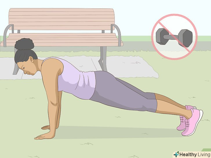 Виконуйте прості вправи, для яких достатньо однієї маси тіла без будь-якого додаткового спорядження.для нарощування м'язів не потрібні тренажери і пристосування: існує безліч різних вправ з власною вагою. Величезною перевагою таких вправ є те, що їх можна виконувати практично скрізь-в офісі, вдома, в парку або будь-якому іншому місці, де у вас видасться вільна хвилинка![16]- До вправ з власною вагою відносяться віджимання, планки, присідання, випади, вправа «альпініст», бурпі (прийом упору лежачи з положення стоячи) та інші.