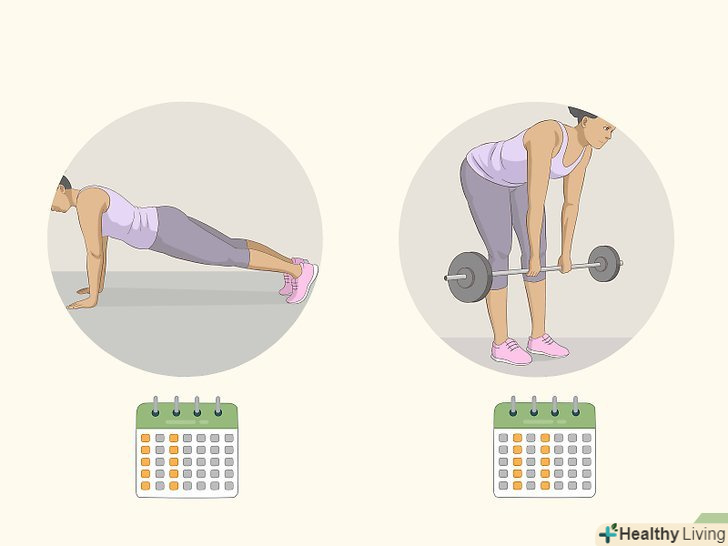 Включіть в свої щотижневі заняття спортом силові тренування.силові вправи також допомагають скинути вагу як в короткостроковій, так і довготривалій перспективі.[14] які б силові вправи ви не виконували (згинання рук на біцепс / трицепс, жим лежачи, віджимання або станова тяга), постарайтеся робити три підходи по 12 повторів в кожному. Щоб підібрати оптимальне навантаження, почніть з невеликої ваги і поступово збільшуйте його до тих пір, поки вам не доведеться докладати певних зусиль, щоб виконати вправу.- Самі по собі силові вправи не спалюють велику кількість калорій. Проте, вони допомагають збільшити м'язову масу, що прискорює обмін речовин і підвищує здатність організму спалювати калорії.[15]