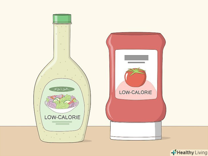 Пошукайте низькокалорійні варіанти своїх улюблених приправ і заправок.приправи є лазівкою, через яку калорії і вуглеводи часто непомітно проникають в різні страви. Наприклад, одна столова ложка (15 мілілітрів) майонезу може містити до 90 калорій! Замініть часто використовувані приправи і заправки їх низькокалорійними аналогами.- Можна також приправляти їжу травами і спеціями, які містять менше калорій і більш ароматні.
