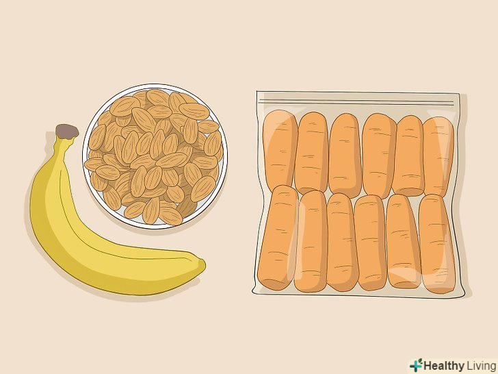 - У продажу є безліч легких закусок в пакетиках порціями по 100 калорій. Запасіться ними і тримайте один або два пакетика при собі на той випадок, якщо зголоднієте протягом дня.[4]