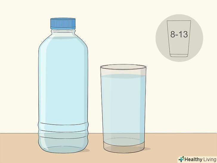 Випивайте протягом дня 2-3, 2 літри (8-13 склянок) води.вода відмінно підходить для того, щоб скинути вагу, оскільки вона наповнює шлунок, зменшує відчуття голоду і при цьому не містить калорій. Намагайтеся щодня випивати близько 8-13 склянок води.[5]- Всупереч розхожій думці, затримка рідини в організмі (і викликане нею здуття живота) пов'язана знедоліком води, а не її надлишком.