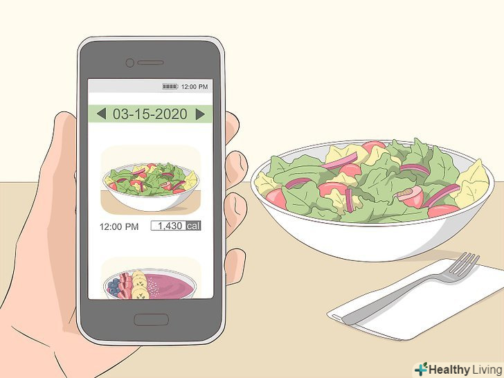 ВедітьЩоденник харчування, щоб відстежувати прийоми їжі.дієтолога досить складно знайти, і його послуги можуть коштувати дорого. Проте, для тих же цілей можна скористатися безкоштовним онлайн-сервісом або додатком для смартфона. Подібні додатки дозволяють фіксувати, що саме і в якій кількості ви з'їли, і в багатьох випадках підраховувати кількість калорій і поживних речовин, які ви вжили протягом дня. За допомогою цієї інформації ви зможете стежити за своїм харчуванням і ставити перед собою більш розумні цілі по зниженню ваги.[7]- При веденні щоденника харчування зверніть увагу на те, в який час дня ви їсте найбільше, з яких продуктів отримуєте найбільше калорій, а також на вміст поживних речовин в основних продуктах вашого раціону. Ця інформація знадобиться вам для того, щоб ще раз подумати, чи правильно ви харчуєтеся.