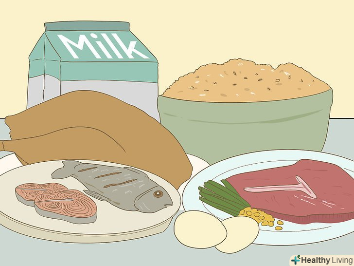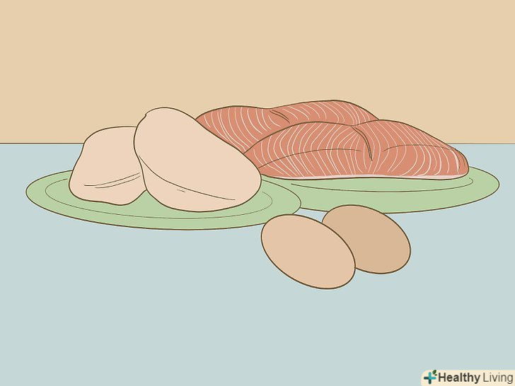 Їжте нежирну білкову їжу.нежирні білки, наприклад курятина і риба, необхідні, якщо ви намагаєтеся позбутися від жиру на животі. Високоякісна білкова їжа допомагає стабілізувати рівень цукру і добре втамовує голод, в результаті ви зможете утриматися від спокуси перекусити після їжі нездоровими продуктами.[16]- Вживання достатньої кількості нежирних білків допомагає також регулювати рівень інсуліну і кортизолу, завдяки чому вам легше буде позбутися від боків.
