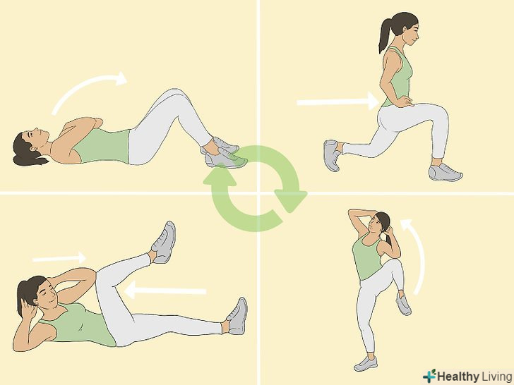 Урізноманітніть свої тренування, щоб уникнути плато.від жиру в області живота буває важко позбутися. Зважаючи на це слід урізноманітнити тренування, щоб забезпечити постійний прогрес і запобігти так званому «плато». Ваші м'язи поступово звикнуть до одного і того ж типу вправ, і з часом вони стануть менш ефективними. Щоб цього не сталося, міняйте вправи і задійте різні групи м'язів — це допоможе вам спалювати більше жиру.[2]- Різноманітність в тренуваннях допоможе вам також уникнути нудьги і підвищити мотивацію.[3]