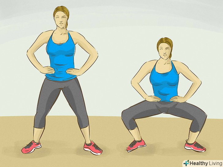 - Присядьте. При цьому голова, тулуб і сідниці повинні як і раніше розташовуватися на одній вертикальній лінії.