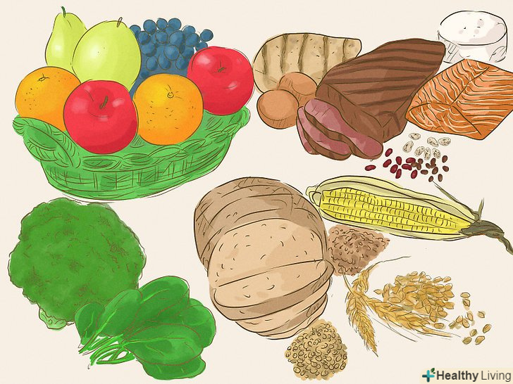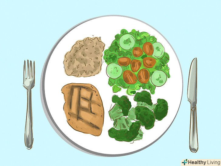 - Включайте в кожен основний прийом їжі 1 порцію білкових продуктів і 2 порції фруктів або овочів.[8][9][10] рекомендується також протягом дня з'їдати 2-3 порції зернових продуктів.
