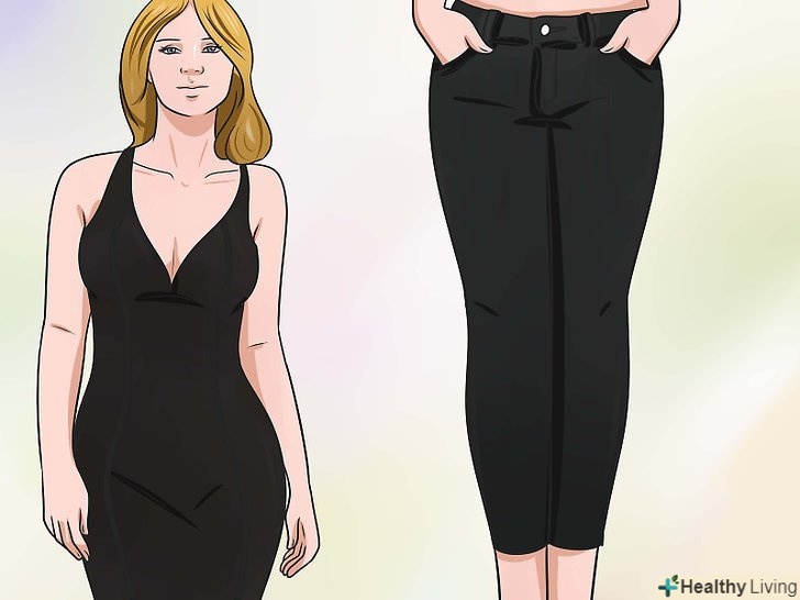 Носіть чорний одяг.чорна або хоча б однотонний одяг допомагає виглядати стрункіше. Цей давній прийом продовжує діяти і в наш час.- Щоб виглядати стрункіше, можна використовувати не тільки чорний одяг. Підійде будь-яка темна одяг, наприклад темно-сині джинси.