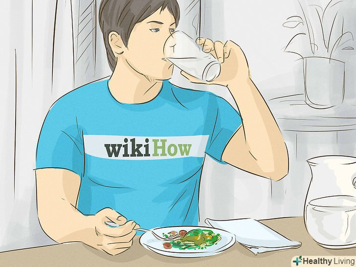Під час прийому їжі чергуйте їжу і воду.вода допомагає перетравлювати їжу, забезпечуючи належну функцію нирок.[6] При цьому, якщо ви будете робити глотки води між укусами їжі, ви також уникнете переїдання. Щоб відчути ситість, організму може знадобитися 12-20 хвилин, тому, якщо ви їсте занадто швидко, ймовірно, ви споживаєте набагато більше їжі, ніж потрібно.[7]- Люди, які дуже швидко їдять, часто відчувають себе об'їдаються і млявими після їжі. Роблячи глотки води між кожним укусами, ви подовжуєте прийом їжі і даєте мозку час зрозуміти, наскільки повний шлунок.