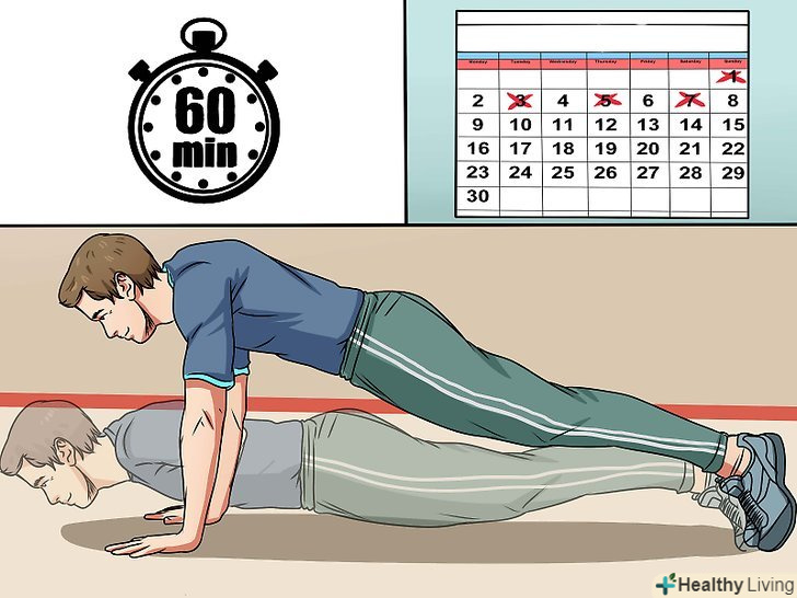 - Тренуйтеся 4 рази на тиждень. Два тренування повинні бути на опірність. За даними клініки Mayo, тренування опору не тільки допомагають побудувати м'язи, але також збільшують ваш метаболізм, спалюють калорії та жир. Дві інші тренування повинні бути з кардионагрузкой. Вибирайте, що Вам подобається-біг, плавання, велосипед або рухливі ігри, і займайтеся цією справою близько години.