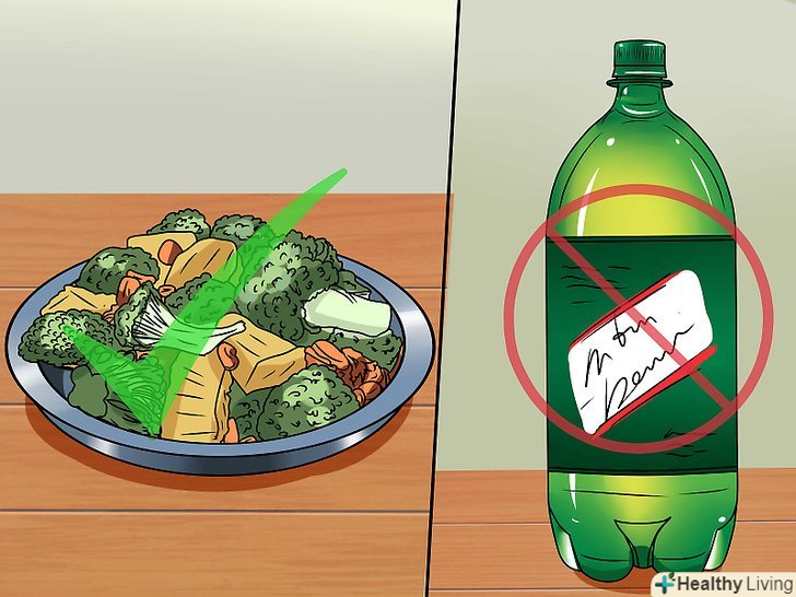Вживайте менше калорій.додайте в дієту більше фруктів, овочів і низькокалорійних продуктів.- Намагайтеся додати, принаймні, одне овочеве блюдо і одне фруктове до кожного прийому їжі, подаючи разом з ними і протеїни, наприклад, курку, рибу, червоне м'ясо або молочні продукти.