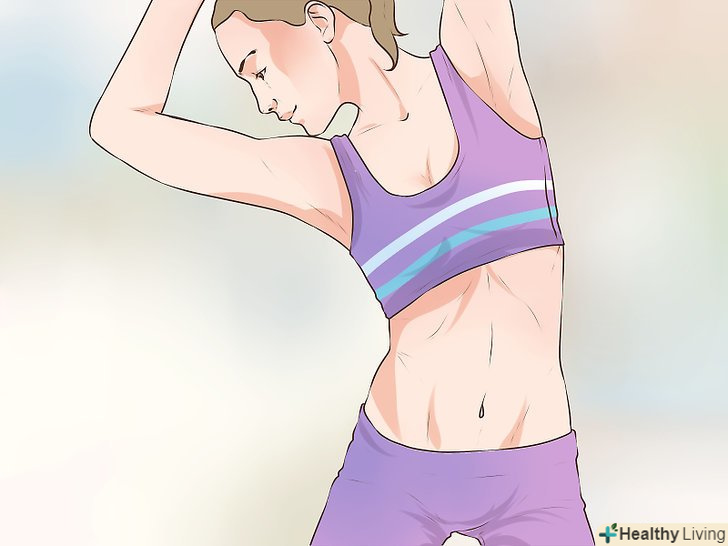 Спробуйте нахили в сторони.хоча неможливо скинути жир в окремому місці тіла, деякі вправи розраховані на область живота. Нахили в сторони збільшують приплив крові до живота, що підвищує рівень кисню і допомагає наростити м'язи на цій ділянці тіла. Крім того, дана вправа допомагає зміцнити все тіло, воно підвищує ефективність тренувань і робить їх менш виснажливими.[6]- Нахиліться в одну сторону і підніміть при цьому протилежну руку над головою. Потім нахиліться в іншу сторону і підніміть над головою другу руку. Робіть по 10 нахилів в кожну сторону. Багато хто використовує при цьому обтяження, однак це не дуже добре для м'язів і може привести до потовщення талії через їх зростання.[7]