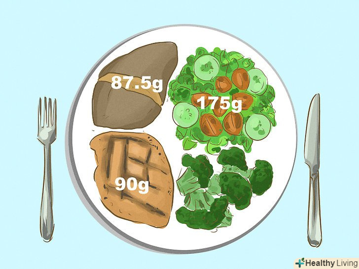 Дізнайтеся більше про контроль порції.за стандартами порції, дорослий повинен з'їдати 90 г білка, 87,5 г крохмалю і 175 г овочів за один прийом їжі. Якщо ви будете їсти більше, ніж необхідно вашому організму, то ваша вага тільки збільшиться; проте, пам'ятайте, що якщо ви станете їсти менше, то ви також можете набрати вагу (або зупинити скидання ваги).- Вам потрібно їсти, щоб підтримувати організм в робочому стані і не давати йому накопичувати вагу. Дивіться на розмір порції і порівняйте їх з предметами навколо. 1 солодкий перець - одна порція овочів-розміром з м'яч для бейсболу. Яблуко - одна порція фруктів-розміром з тенісний м'яч. Одна порція пасти-розміром з хокейну шайбу. Одна порція сиру повинна виглядати як 4 доміно. А курка? Уявіть колоду карт.
