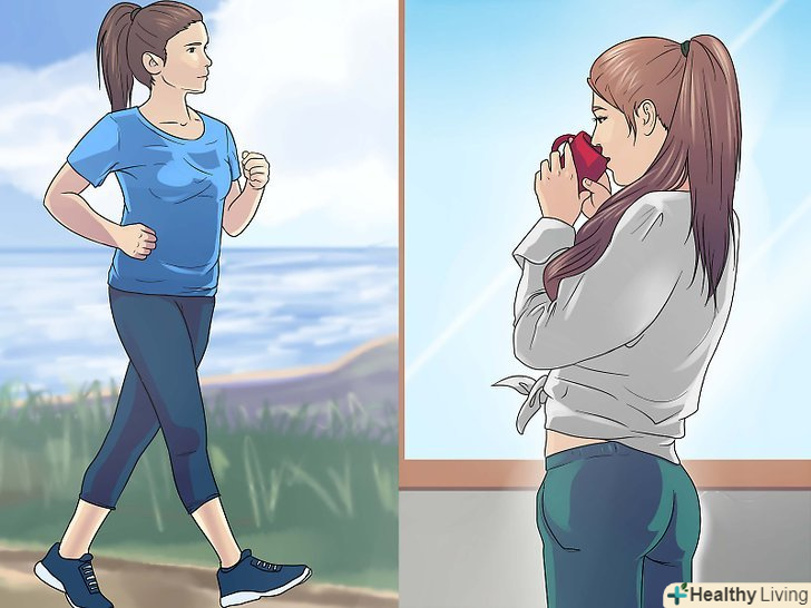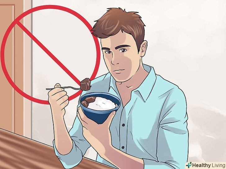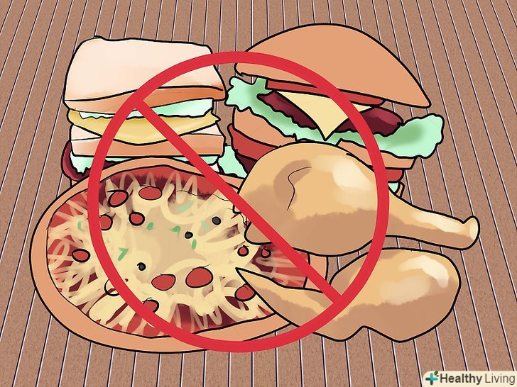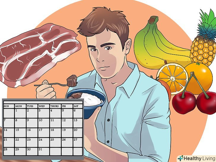 Їжте регулярно і збалансовано.дуже важливо приймати їжу регулярно і стежити за збалансованістю страв. Пропуск чергового прийому їжі або занадто довгий голодування можуть посилити відчуття голоду, через що вам буде складно дотримуватися обраної дієти.[3]- Регулярний прийом їжі допомагає підтримувати обмін речовин, що сприяє скороченню жирових відкладень.