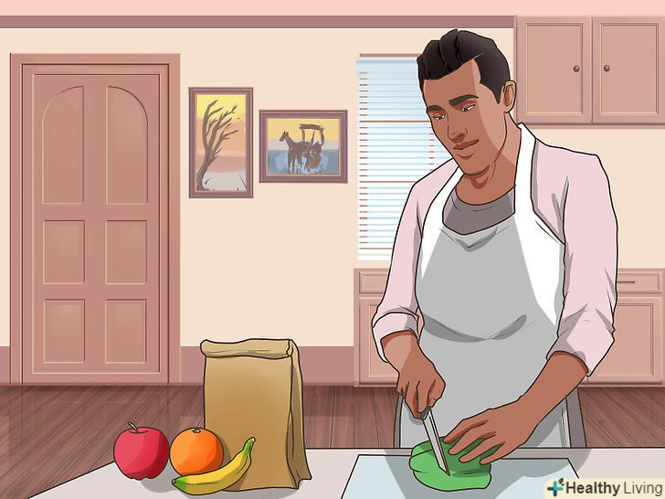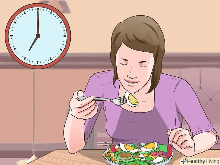 Їжте регулярно.якщо ви станете пропускати прийоми їжі, то почнете набирати вагу. Не відмовляйтеся від сніданку, обіду і вечері, а також здорових закусок в перервах між основними прийомами їжі.[3] через сильний голод ви почнете переїдати. Завжди тримайте в своєму шафці або портфелі кілька батончиків, горіхів, яблук та інших здорових закусок, щоб з'їсти їх, коли зголоднієте.- Ні в якому разі не пропускайте сніданок! В іншому випадку ви будете голодні і знесилені. Пропуск сніданку навіть може призвести до набору ваги.[4]