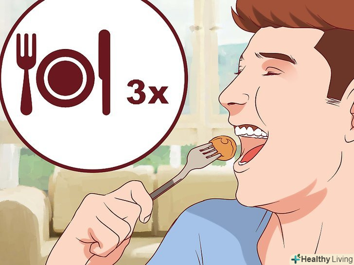 Їжте не менше трьох разів на день.важливо їсти хоча б тричі на день з рівномірними інтервалами. Це особливо актуально для підлітків, яким потрібні сили, щоб вчитися.- Плануйте їсти сніданок, обід і вечерю кожен день. Також можна дозволити собі полуденок.