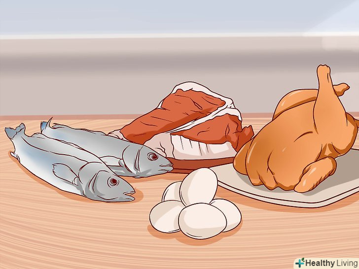 Їжте більше білка.білок-вкрай важливий елемент для підлітків. Білок допомагає боротися з голодом, наповнює людину енергією, сприяє зростанню і розвитку організму.[10]- Їжте нежирний білок з кожним прийомом їжі. Не забувайте стежити за розміром порції білка. Одна порція білка-це 85-115 грамів, або розмір долоні без пальців.[11]