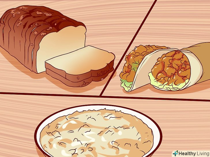 Їжте помірну кількість цільнозернових злаків.разом з фруктами і овочами цільнозернові злаки дозволяють збільшити кількість клітковини, що надходить в організм.- Основна частина вашого раціону повинна припадати на нежирний білок, фрукти та/або овочі, проте час від часу слід також їсти злаки. Одна порція повинна дорівнювати приблизно 40-90 грамам.[14]