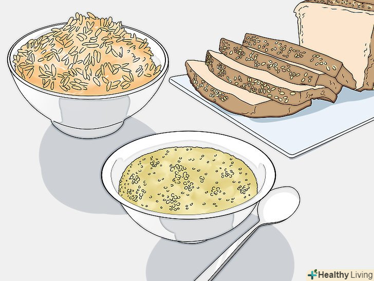 Зверніть увагу на цільнозернові продукти.вибирайте кіноа, коричневий рис і ячмінь і цільнозерновий хліб. Чим менше оброблено зерно, тим корисніше воно для вашого організму.- Вибирайте цільні зерна з низьким глікемічним індексом. Це означає, що вони не шкодять вашому рівню цукру, а також ви будете почувати себе ситими довше.