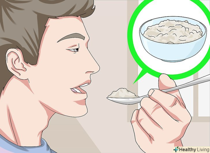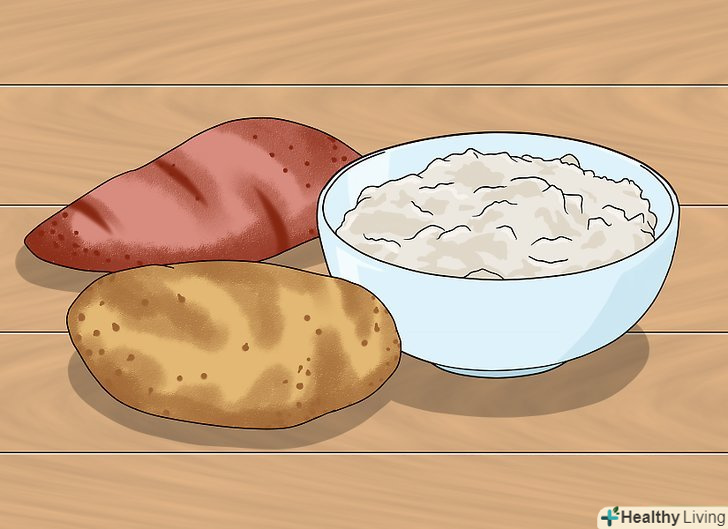 Вибирайте складні вуглеводи. як приклад простих вуглеводів можна привести цукор. Він швидко засвоюється організмом і забезпечує короткий сплеск енергії, але не зможе давати сили тривалий час. Складні вуглеводи забезпечують організм необхідною енергією і не так часто відкладаються у вигляді жиру. [15]- До корисних джерел складних вуглеводів можна віднести нешліфований рис, вівсяну крупу, борошно грубого помелу, печена картопля, солодка картопля або батат.