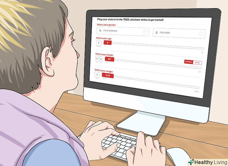 Визначте свій добовий витрата енергії і калорій (СРК). СРК включає БОВ плюс інші калорії, які спалюються протягом дня. Калькулятор СРК можна знайти в Інтернеті. [4]- Слід розуміти, що отримати точне значення СРК вельми складно, але завдяки чесним відповідям про щоденному рівні активності можна дізнатися хоча б приблизне значення.