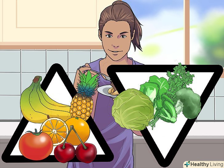 Їжте фрукти та овочі. для початку з'їдайте 7-9 порцій в день, а потім спробуйте довести це число до 11 порцій. Їжте свої улюблені фрукти і овочі і пробуйте нові, щоб урізноманітнити свій раціон. Пошукайте нові рецепти і способи приготування. З фруктів можна готувати різноманітні смузі. Більшість овочів можна запікати в духовці при високій температурі, якщо ви не хочете їсти їх в сирому вигляді. [11]