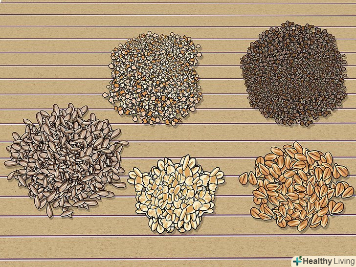 Вибирайте продукти з цільних зерен. цільні зерна включають висівки, насіння та ендосперм. До поширених продуктів із цільних зерен належать ячмінь, вівсяні пластівці, кіноа, коричневий та кольоровий рис, деякі види пшениці (спельта, полба, камут) тощо. Продукти з цільних зерен забезпечують організм вуглеводами в їх найбільш корисній формі. Врахуйте, що в наш час у продажу є безліч досить смачних сортів макаронів і хліба з цільних зерен. [12]