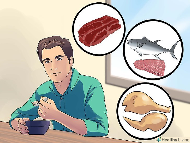 Вживайте білки. джерелом білків служать горіхи, бобові, яйця, риба і нежирне м'ясо. М'ясо вважається нежирним, якщо на шматочок масою 21 грам припадає менше 10 грамів жирів. Це індичатина і курятина, а також деякі види червоного м'яса. Вибирайте спинні і філейні частини. Риба і нежирне м'ясо являють собою прекрасні джерела білка. Проте, хоча ці продукти є невід'ємною частиною збалансованої дієти, вони не повинні складати її основу. Кількість овочів і фруктів має перевищувати частку нежирного м'яса. [13]- Розмір однієї порції м'яса повинен відповідати вашій долоні. Якщо ви будете їсти більше м'яса, ніж необхідно вашому організму, то тим самим лише збільшите число калорій!