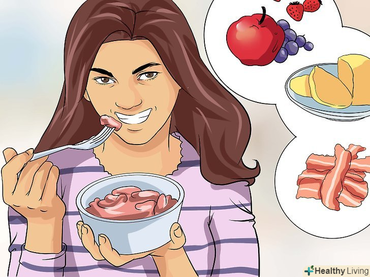 Дотримуйтеся збалансованої дієти.це не означає, що ви повинні обмежувати себе в їжі. Тим не менш, важливо, щоб ваш організм отримував різноманітні вітаміни, мікроелементи та інші поживні речовини, необхідних для вашого здоров'я в цілому.- Включіть в свій раціон джерело м'ясного білка. Протеїн допомагає довше відчувати відчуття ситості, що сприяє втраті ваги.[11] у кожен прийом їжі необхідно вживати 80-100 г яловичини, свинини, морепродуктів, молочних продуктів, птиці, яєць, бобових або сої.