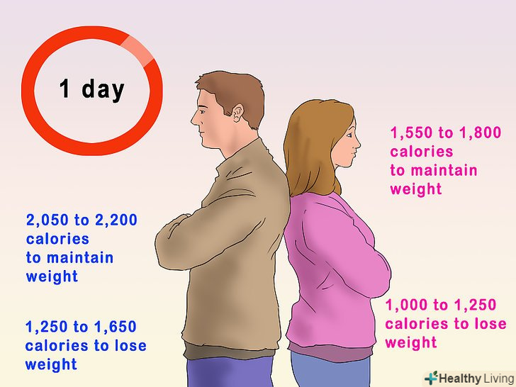 - Чоловікові у віці 19-30 років, який веде малорухливий спосіб життя, потрібно 2050-2200 калорій для підтримки ваги і 1250-1650 калорій для схуднення.[16][17]