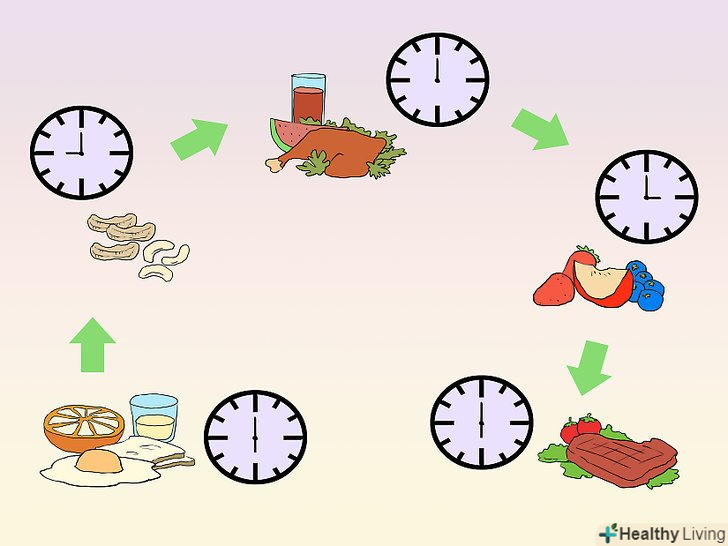 Їжте маленькими порціями і часто.якщо їсти 2-3 рази на день великими порціями, в проміжках між прийомами їжі обмін речовин буде сповільнюватися. Якщо з'їдати невелику порцію кожні 3-4 години, метаболізм буде працювати постійно, і ви будете витрачати більше калорій протягом дня.[19]