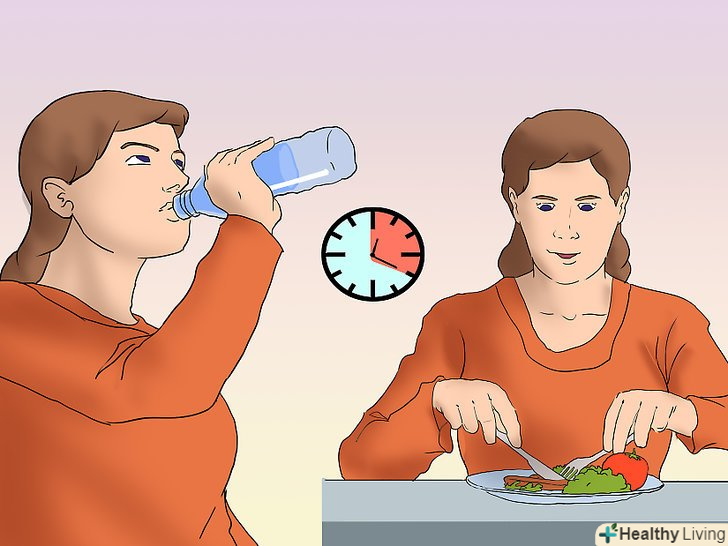 Пийте більше води.вчені з'ясували, що якщо випивати 375 мілілітрів (для жінок) або 500 мілілітрів (для чоловіків) води перед кожним прийомом їжі, людина відчуває себе більш ситим і з'їдає менше.[8][9] якщо ви п'єте мало води, цей прийом допоможе вам скинути якусь кількість ваги досить швидко.- Щоб зрозуміти, скільки води вам потрібно пити кожен день, розділіть свою вагу на 30-це дасть ту кількість води в літрах, яке вам потрібно пити. Наприклад, жінці вагою 60 кілограмів потрібно випивати 2 літри води в день.