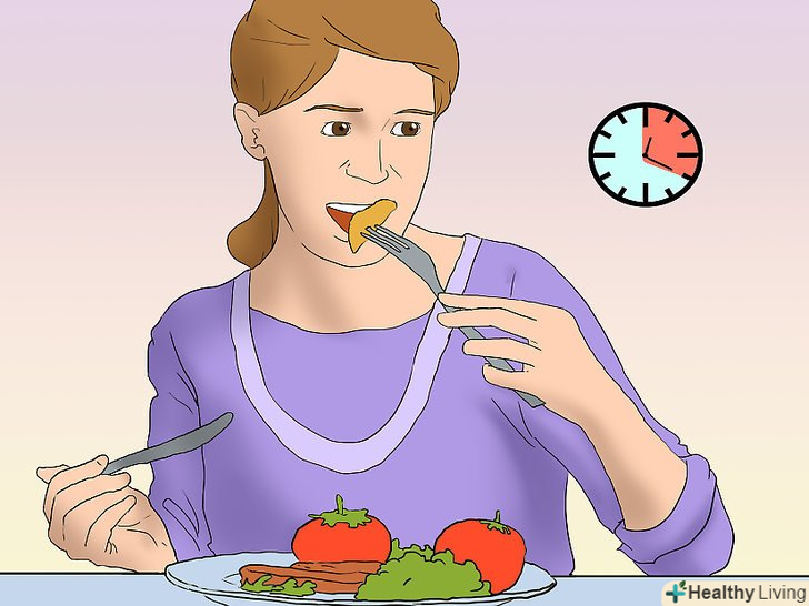 Їжте повільно.на те, щоб з мозку в шлунок надійшов сигнал про те, що людина наївся, потрібно близько 20 хвилин.[22] якщо проковтнути все за 10 хвилин, можна випадково з'їсти більше, ніж вам потрібно для насичення. Не поспішайте і отримуйте задоволення від їжі. Спробуйте поставити таймер на 20-30 хвилин, щоб контролювати швидкість.- Деякі люди роблять паузу в 2-3 хвилини між ковтками або укусами.