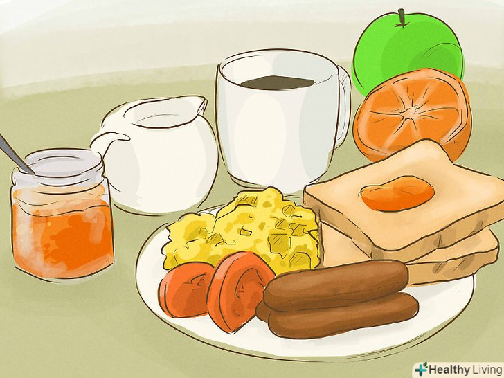 Завжди снідайте.багато людей пропускають сніданок, сподіваючись схуднути, проте прийом їжі через годину після пробудження допомагає запустити метаболізм і підтримувати рівномірний рівень цукру в крові протягом усього дня, що зробить фізичні вправи більш ефективними, а вас наповнить енергією.- Намагайтеся їсти в один і той же час кожен день, починаючи з сніданку. Для сніданку вибирайте продукти, багаті клітковиною, цільнозернову їжу, свіжі фрукти і корисний білок (наприклад, яйця). Відмовтеся від цукру і солодких пластівців, а також швидких вуглеводів.