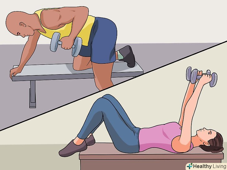 Силові тренування.на додаток до кардіотренувань, силові тренування також допоможуть в боротьбі із зайвою вагою. Вони зміцнюють м'язи, які спалюють калорії і підтримують загальний стан здоров'я.[37]- Перед початком силових тренувань варто проконсультуватися з лікарем і, можливо, навіть з сертифікованим тренером, який розробить найкращий план, враховуючи Ваші можливості і потреби.