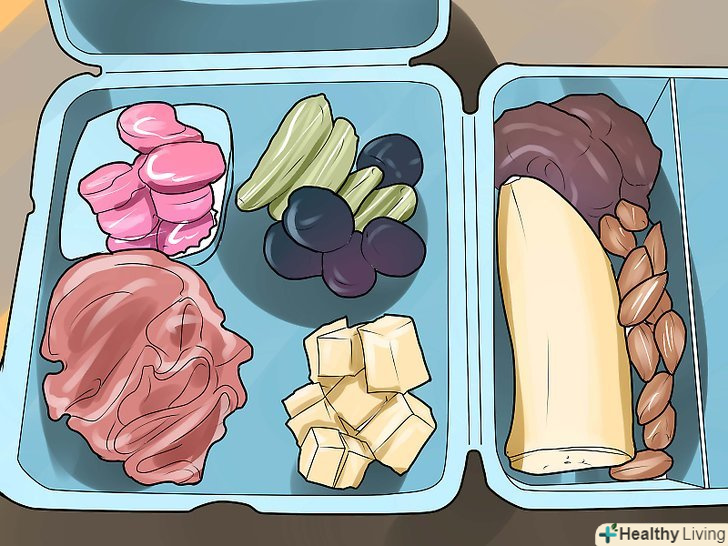 - Приготуйте обід зі здорової їжі, який ви можете з'їсти, коли Вам особливо не важливо, що їсти, або вам потрібно швидко щось перекусити. Замість того, щоб запасатися нескінченною пастою і горіховим маслом і джемом, завжди тримайте вдома інгредієнти для салатів і набір вегетаріанця.