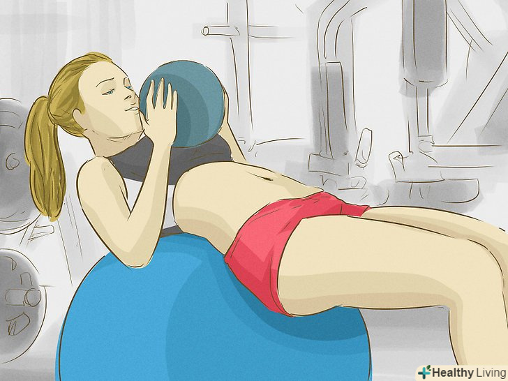 Робіть вправи на прес.серед професійних спортсменів немає одностайної думки щодо того, чи є вправи на прес найкращим способом зробити м'язи живота плоскими, але ніхто не заперечує той факт, що вони дозволяють безпосередньо опрацьовувати передні і бічні м'язи живота.- Тазовий нахил на м'ячі. Ляжте на фітбол спиною і головою, поставте ноги разом на підлозі, а в руки візьміть 2,5–5-кілограмові гантелі або медичний м'яч і тримайте навпроти грудей. Напружте черевні м'язи і підніміть тулуб, поки ваші плечі не відірвуться від м'яча. Потім підніміть руки з гантелями або м'ячем вгору. Зробіть три підходи по 12-15 разів з 30-секундною перервою.