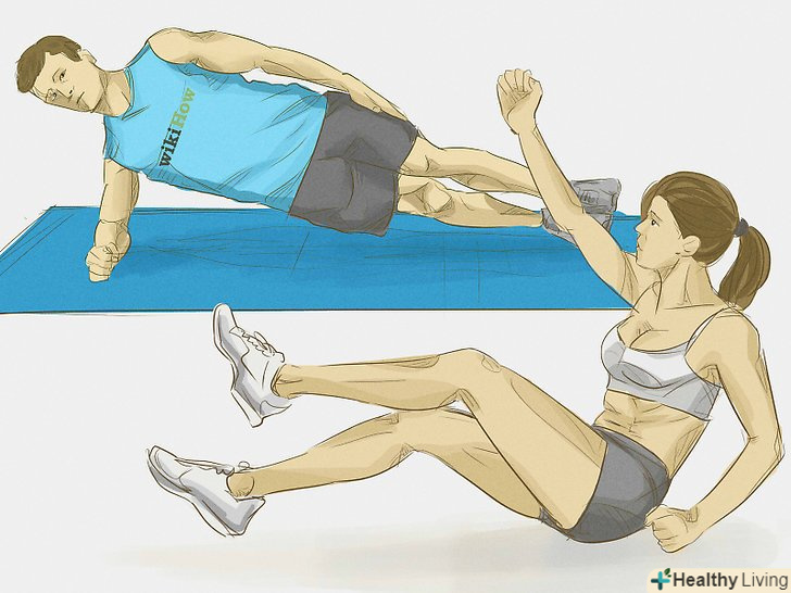 Працюйте над мишами кора.до них відносяться м'язи живота, м'язи нижньої частини спини, таза і стегон — більше 15 м'язів в цілому. Щоб живіт був дійсно плоским, необхідно працювати з усіма цими м'язами.- Бічна планка. Ляжте на лівий бік, зігніть лікті безпосередньо під плечима, а ноги складіть один на одного. Покладіть праву руку на ліве плече або на праве стегно. Напружте прес і відірвіть стегна від підлоги, поки ви не будете балансувати на передпліччя і ногах так, що ваш тулуб утворює діагональну лінію. Зафіксуйте позицію на 30-45 секунд. Повторіть на протилежній стороні.
