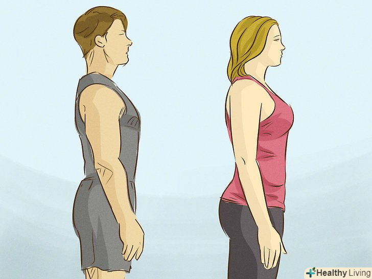 Покращіть поставу.хороша постава може візуально позбавити від двох кілограм, так чому б не скористатися цією можливістю. Стійте з розслабленим тазом і злегка вигнутою назад спиною. Грудна клітка повинна знаходитися на одній лінії з животом. Відведіть плечі назад і злегка їх опустіть. Тримайте голову по центру, уявіть, що шия є продовженням спини, а до неї прив'язана мотузка, яка злегка піднімає верхівку.