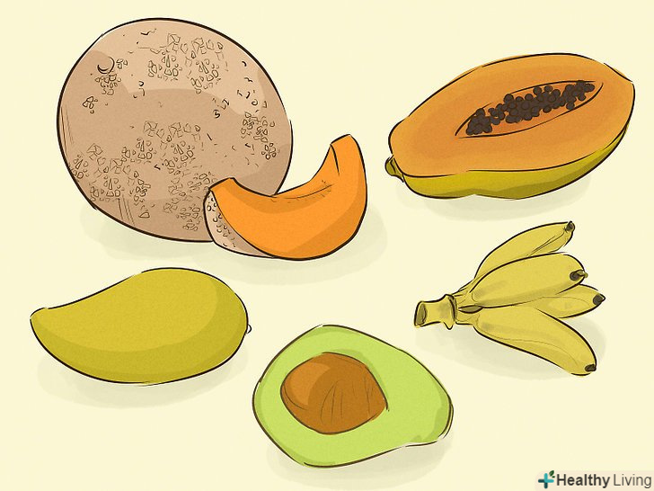 Вибирайте продукти, багаті калієм.їжте багаті калієм продукти, такі як авокадо, міні-банани, папайя, манго, диня і знежирені йогурти (без додавання штучних підсолоджувачів). Калій є природним сечогінним засобом, так що він допоможе зменшити затримку води і набряклість.[5]